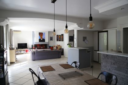 Salon cuisine ouverte 65m2, 1 wc, 1 chambre 9,90 m2, 1 arrière cuisine 16m2, garage 30 m2, 2 parkway, cour arborée devant, terrasse 40 m2 et jardin derrière.