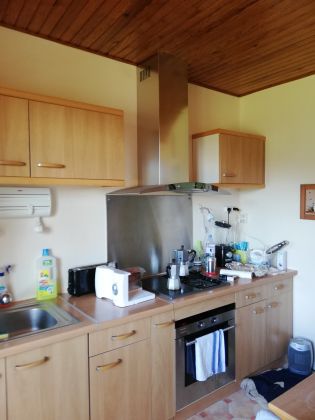 Rez-de-chaussée légèrement surélevé (perron). Cuisine aménagée, salon/salle à manger spacieux, une chambre,