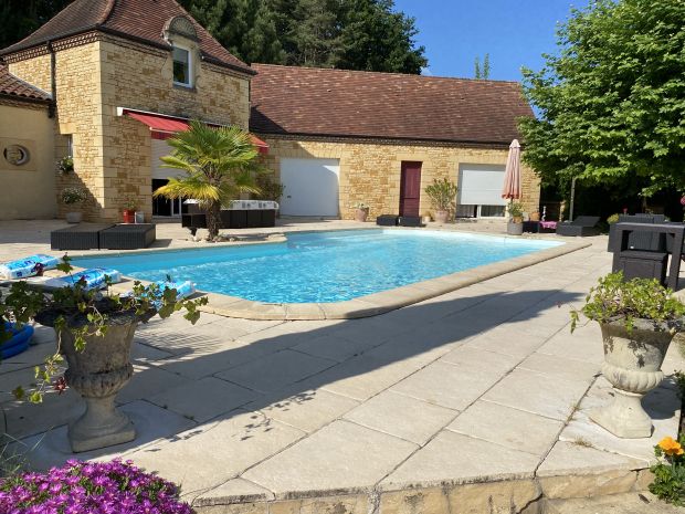 1 maison d'architecte, en pierre tout confort, géothermie, cuisine bien équipée avec îlot central, salle à manger avec cheminée, piscine sur grande terrasse, sur les hauteurs de Sarlat la Canéda, sans aucun vis-à-vis.