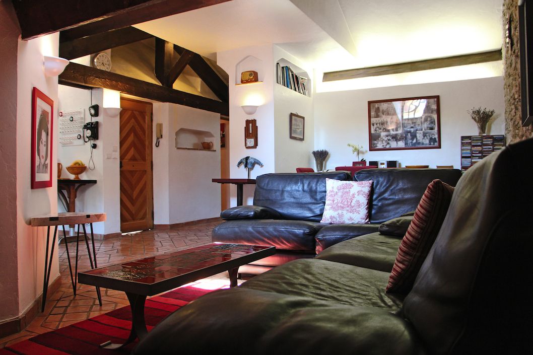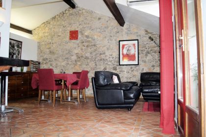 Le style de la salle à vivre est typé Provençal avec un mur en Pierres véritables, des poutres centenaires, un authentique sol en terre cuite artisanale sur l'ensemble du séjour, salon, couloir et cuisine, les murs sont décorés de niches très méditerranéennes.
