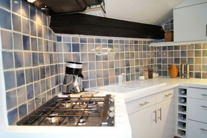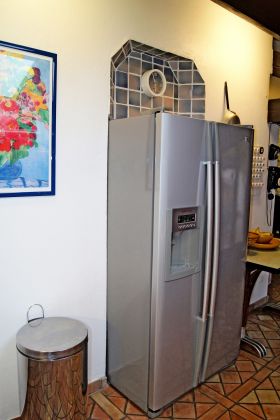 La cuisine carrelée aux murs de céramique de Salernes est entièrement équipée avec réfrigérateur américain, four à vapeur et multifonctions, hotte aspirante, piano de cuisson en fonte, etc.
