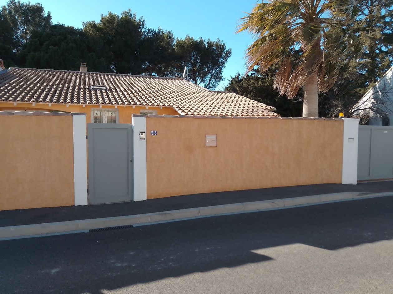 Terrain entièrement clôturé, petit portail d'entrée + portail automatisé s'ouvrant sur 3 places de parking en enfilade pour 3 SUV ou camping-car et voiture.