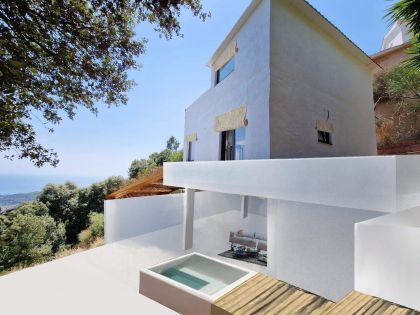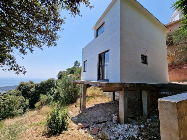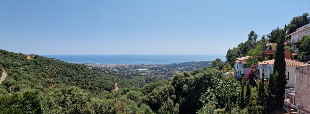 A 50 kms de Barcelone Espagne ,maison de vacance vue mer de toutes les pièces en haut d une colline dominant la station balnéaire de pineda de mar sur la Costa brava ,train toutes les 30 minutes pour Barcelone direct ramblas ,60 m2 Habitables et un projet ( image 3 D ) pour le sous sol de 40 m2 suplementaires avec petite piscine possible ,style bohème chic ,finca