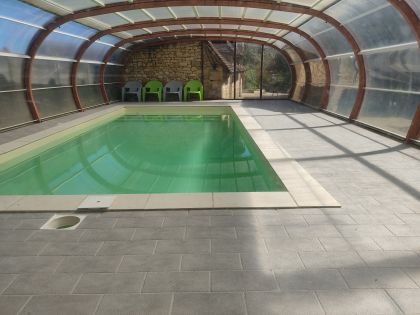 Extérieur : Grand parking privé, cour et diverses dépendances en pierres, terrain 3600m2 (1500m2 plat, le reste en pente) 150m2 de cave sous la maison et enfin une belle piscine couverte par une verrière.