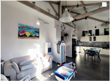 Bat 1: (65m2)La maison principale, fonctionnelle et de plain-pied, comprend un bel espace séjour/cuisine plafond cathédrale avec accès terrasses, 2 chambres avec salle d'eau privée et toilette séparée.