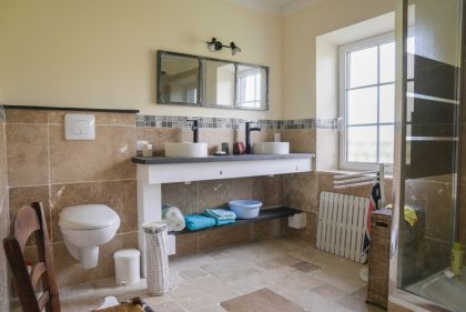 Dans un cadre champêtre, exposée à l'Est à l'Ouest, la maison de 140 m2 est flanquée au Sud et au Nord de 2 gîtes meublés de 70 et 90 m2, ainsi que d'un grand garage abritant véhicules et équipements de jardin.