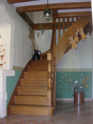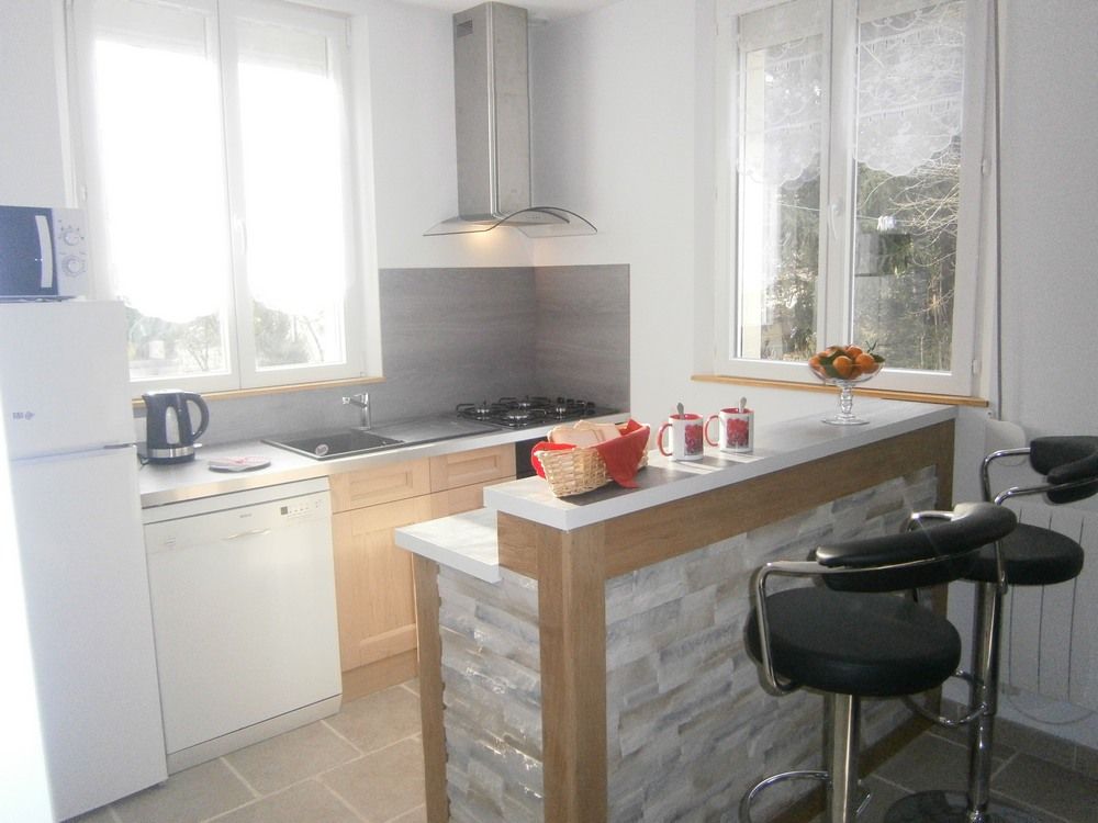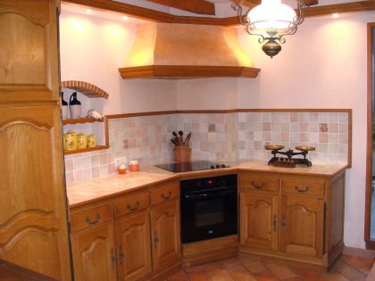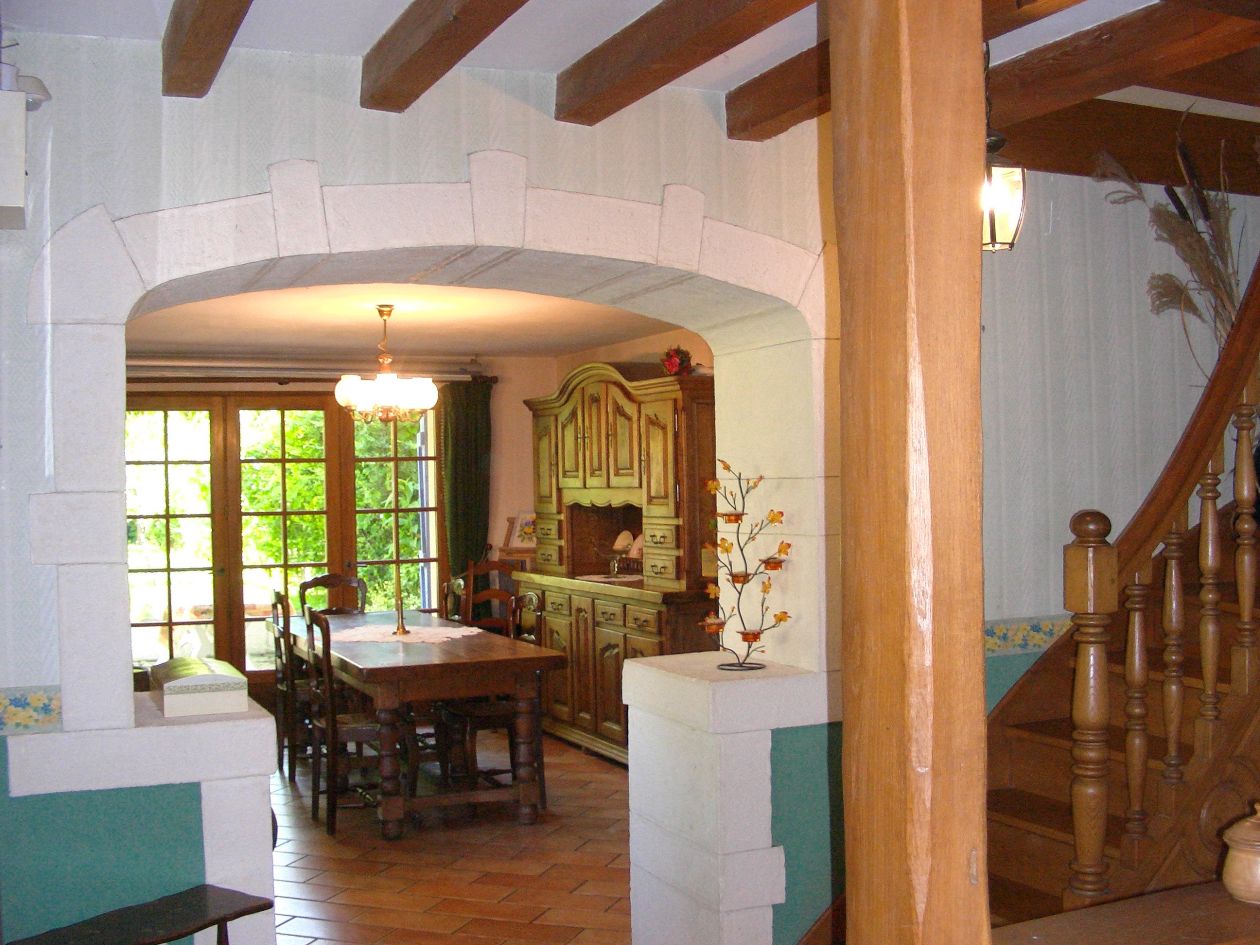 - au RDC : salle à manger (avec insert) séparée de l'entrée avec une voûte imitation pierre, cuisine ouverte aménagée en chêne massif, salle de bain, WC et buanderie.