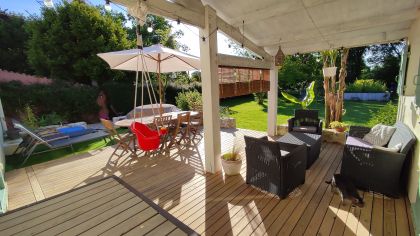 - Terrasse arrière en bois et gazon synthétique, parfaite pour accueillir un jacuzzi ou des moments de convivialité.