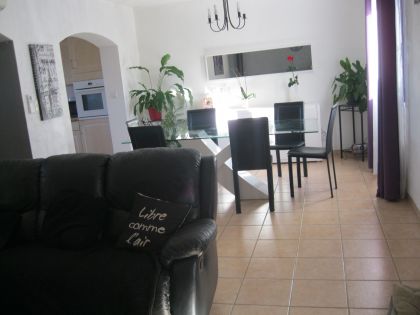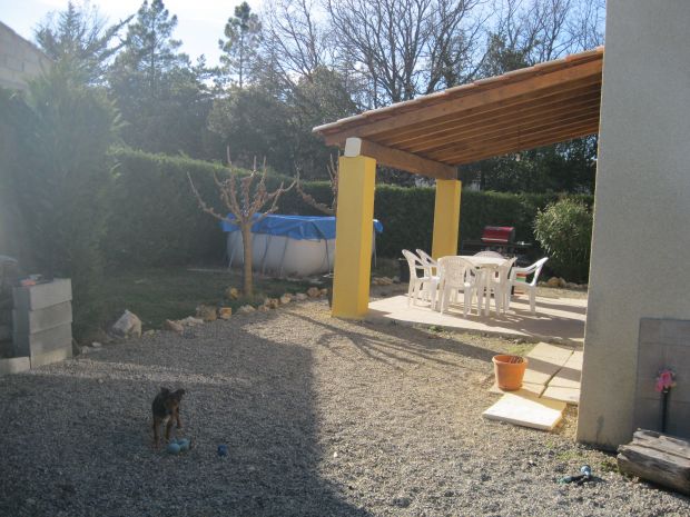 une entrée avec placards et un WC , une cuisine semi ouverte et une salle a manger de 27m2 , jardin clôturé de 700m2 avec piscine hors sol et terrasse couverte