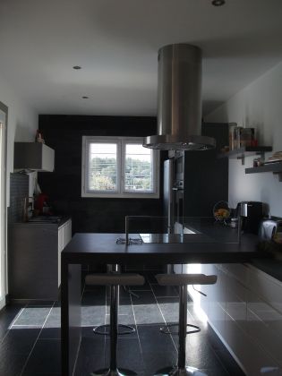 Espace de vie lumineux, cuisine contemporaine équipée, orientation sud.
