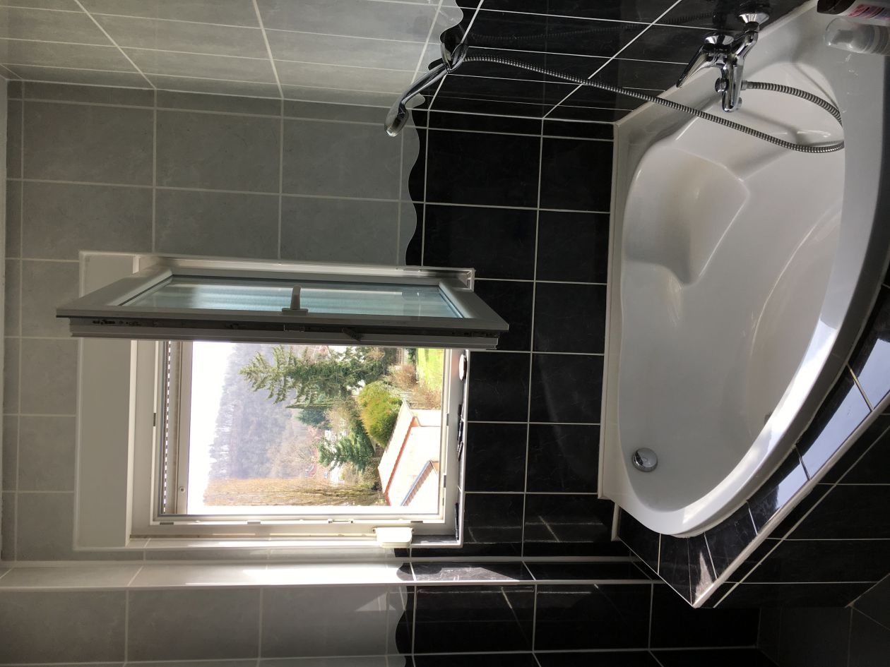 Salon, cuisine équipée, salle de bains lumineuse, douche + baignoire. Double vasque. Toilettes séparés.