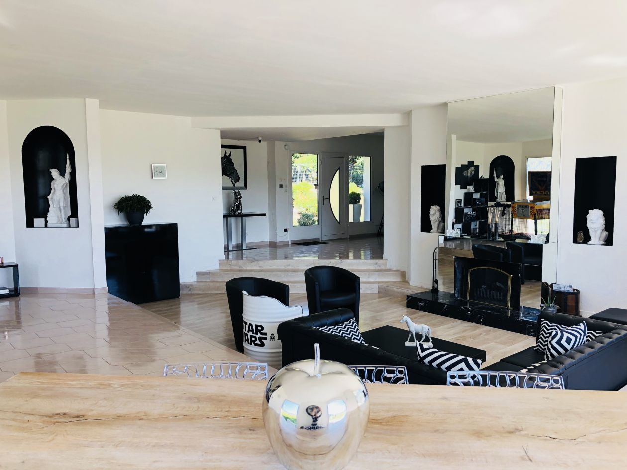 Maison entièrement restaurée cette année sur 6500 m2 de parc fleurie et arborée avec Vue exceptionnelle sur la campagne dégagée et imprenable grand parking 10 voitures 5 chambres à l étage avec salle de bain + bureau + grand dressing Au rdc immense salon de 80 m2 Cuisine 35 m2 dressing et garage + f2 dans le jardin indépandant et chalet pour rangement. Portail électrique poulailler et bassin. Villla estimée au dessus de 500000€ vente rapide Prix actuelle proposée 450000€ Échange contre villa autour de Nîmes ou Nîmes